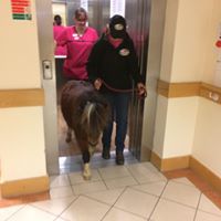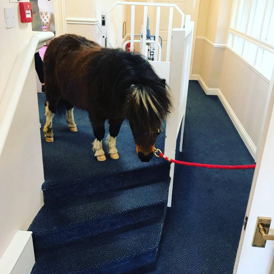 Timothy the Miniature Shetland Pony making his way through reception to meet residents in the lounge